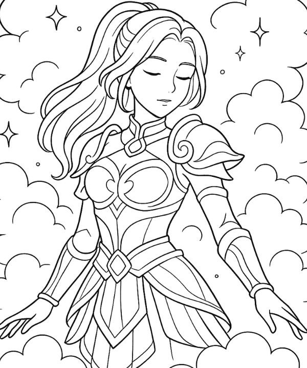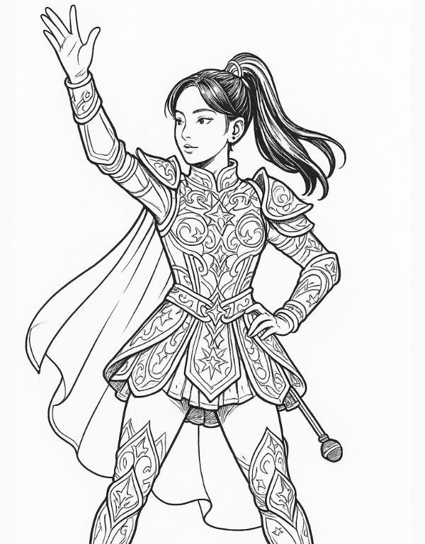 Bright Idol Warrior Beneath a Cosmic Sky Armour of Stardust and Stage Energy This page describes a vibrant figure with the Divine (idol warrior) template, an idol hero shimmering beneath the celestial sea, armored in starlight and the essence of performance. A combination of traditional Korean motifs and futuristic tech, the armor shimmers with complex detail. Consider any plate or gem options that call for gradients of color and metallic pops. A wonderful page for gold, silver and purple shades; it represents the power and grace of a cosmic performer.