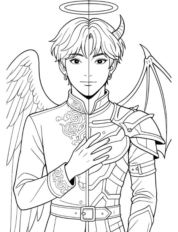 This design is an eye-catching double image of half angel and half demon, perfectly capturing the dichotomy of idol life. The left one shines with divine light while the right sparks with darkness. Color this page with contrasting palettes: pure whites and yellows versus deep crimsons and violets. It’s a favorite among those who adore symmetry, meaning and telling stories with color.