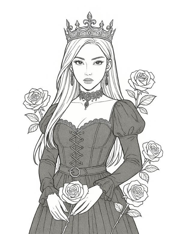 Majestic and mysterious, the queen idol sits upon a throne of roses and skulls. Her gown features lace, pearls, and velvet folds begging for deep reds and royal purples. Behind her, a gothic castle looms. This page is ideal for fans of baroque, Victorian, or gothic fantasy coloring themes.