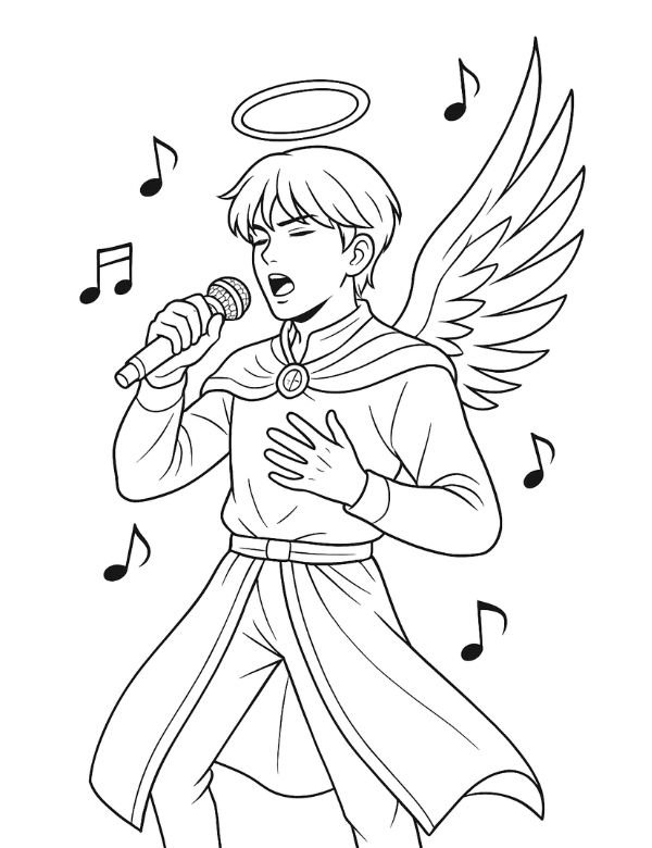 A winged chidol that floats in the middle of a song as notes glisten around it. The supernatural aspects of the design wings, glowing aura and elaborate jewelry like Travis Scott are ideal for pearl, pastel and metallic treatments. This page captures that kind of pure voice and the power to banish darkness on melody alone.