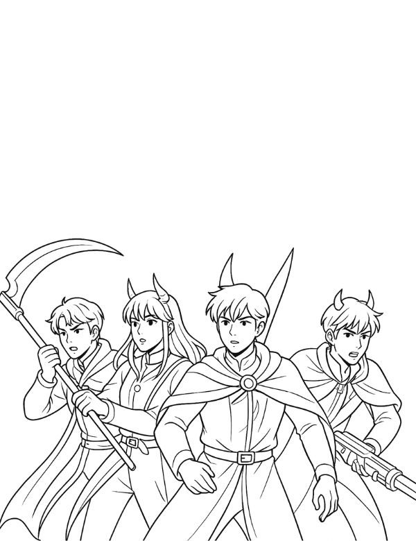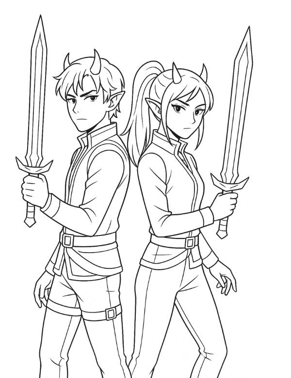 Two idols stand back-to-back, their twin blades gleaming under icy moonlight. The symmetry of the composition makes it perfect for experimenting with dual color tones frosty blues, silvers, and whites. Their expressions reveal unspoken trust and unity. This page is a fan favorite for friendship, teamwork, and balance.